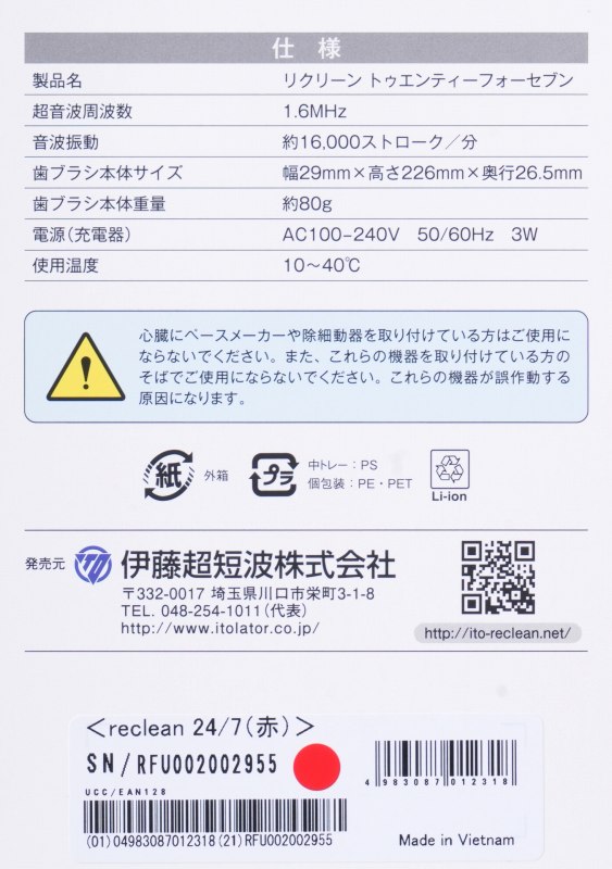 伊藤超短波 reclean(リクリーン)24/7 (赤)(超音波歯ブラシ)