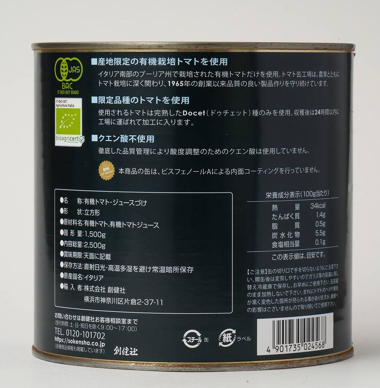 創健社 業務用有機ダイストマト缶 2,500g(固形量1,500g)