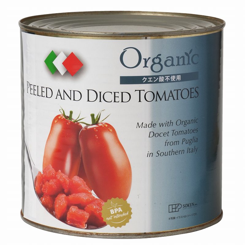 イタリア南部のプーリア州で栽培された有機トマトだけを使用。トマト缶工場は、農家とともにトマト栽培に深く関わり、50年以上にわたって品質の良い製品作りを守り続けています。ダイスカットした立方形タイプ。ビスフェノールA(BPA)不使用缶。