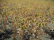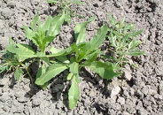 葉は、高さが10cm程度に伸び、整然と植えられています。土の表面はカラカラに乾いているが、 粘土質の土を15cm程掘り返すと水分を含んでいて、根は20cm程度伸びています。成長すると根は、 3m程伸びて地下の水を吸うので乾燥に強く、水を与える必要もなくなってきます。