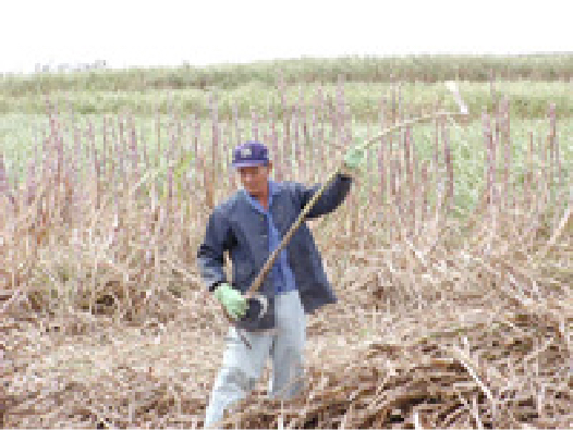 背丈よりも大きく育ったサトウキビを手刈りや機械で収穫していきます。収穫されたサトウキビは、その日のうちに工場へ運ばれ、糖液を搾り出されます。