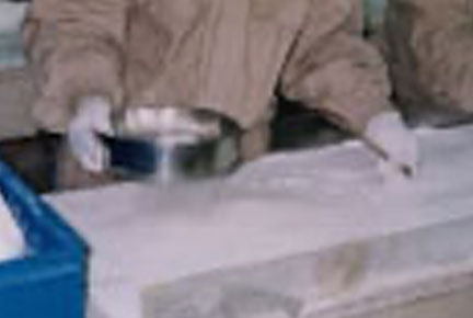 減退に包装された塩(写真上)はイタリアから出荷され、いったんベトナムゲアン省のある日本の製塩業者の現地子会社に入れ丹念に検品されます。 目視による異物検査(写真下)それからまた日本でチェックし、袋詰めされます。