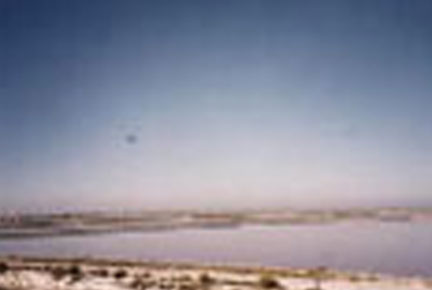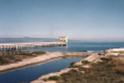 滋味豊かな地中海の海水を大型ポンプで塩田に引き込みます。 海水の取水口(写真上)、ポンプで水をんだ塩田全景(写真下)