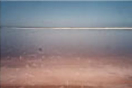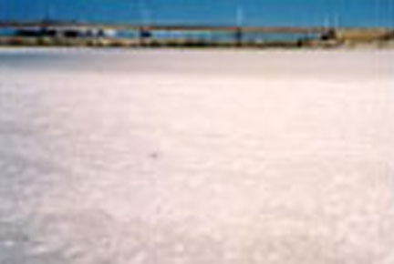 塩が徐々に結晶化し始めます(写真上) 半年間じっくりと太陽と風と光の力で結晶化した収穫直前の塩田(写真下)